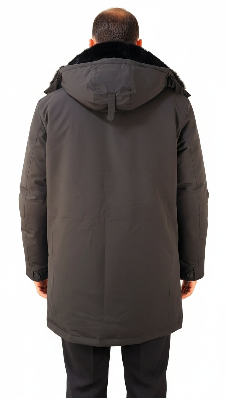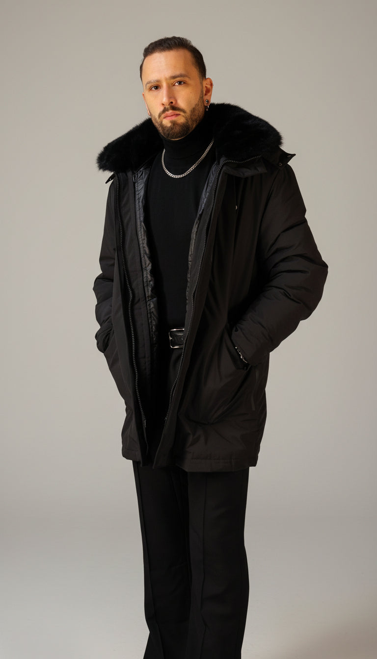 Featuring a matte black exterior and a soft faux-fur collar, it delivers a refined winter look ideal for everyday wear or elevated streetwear styling.