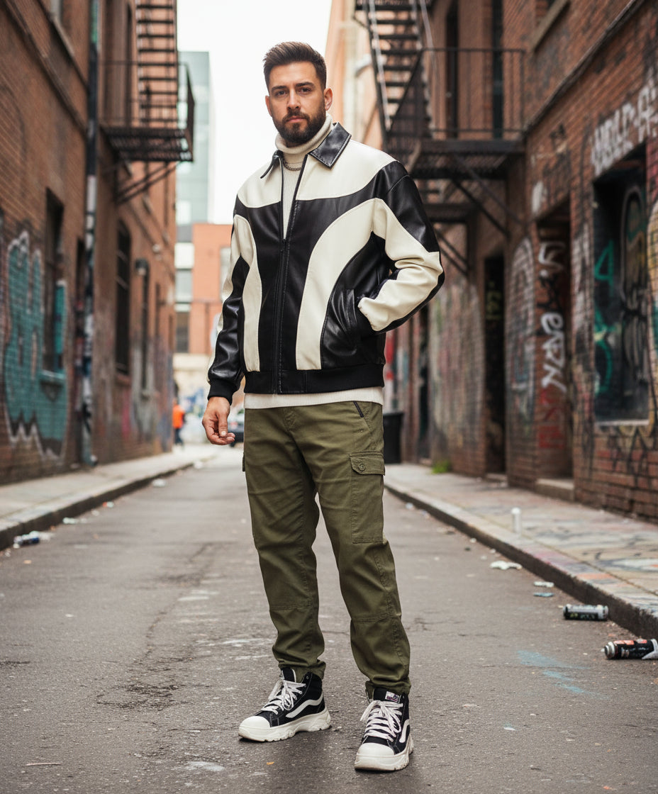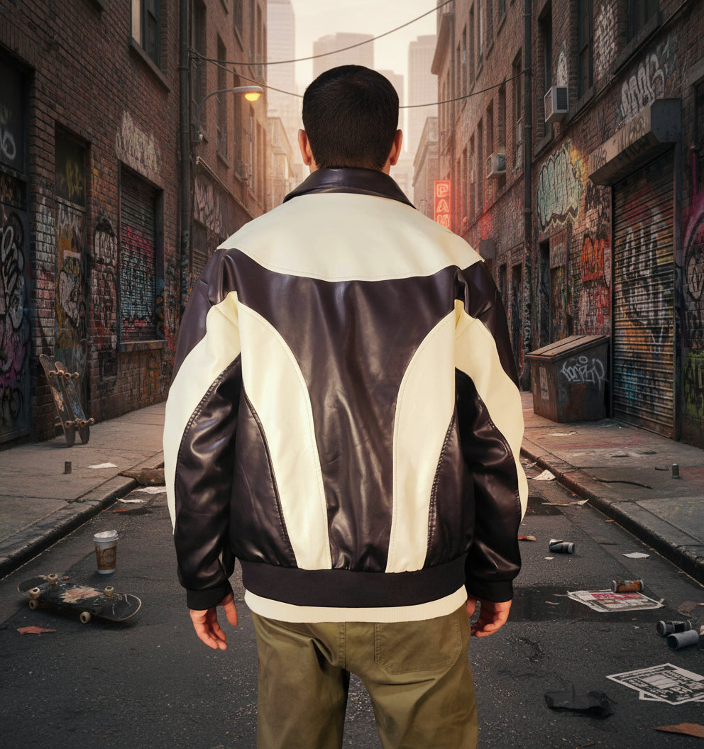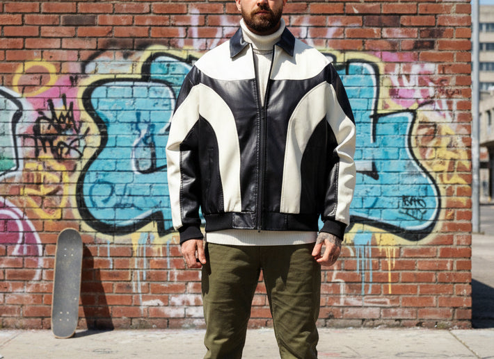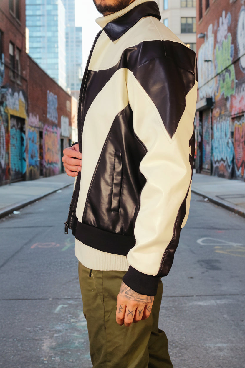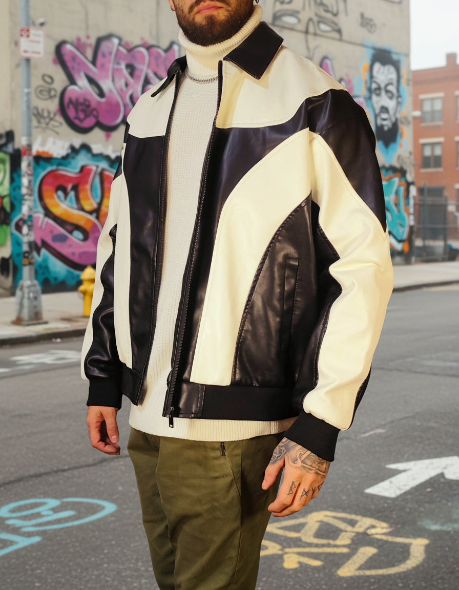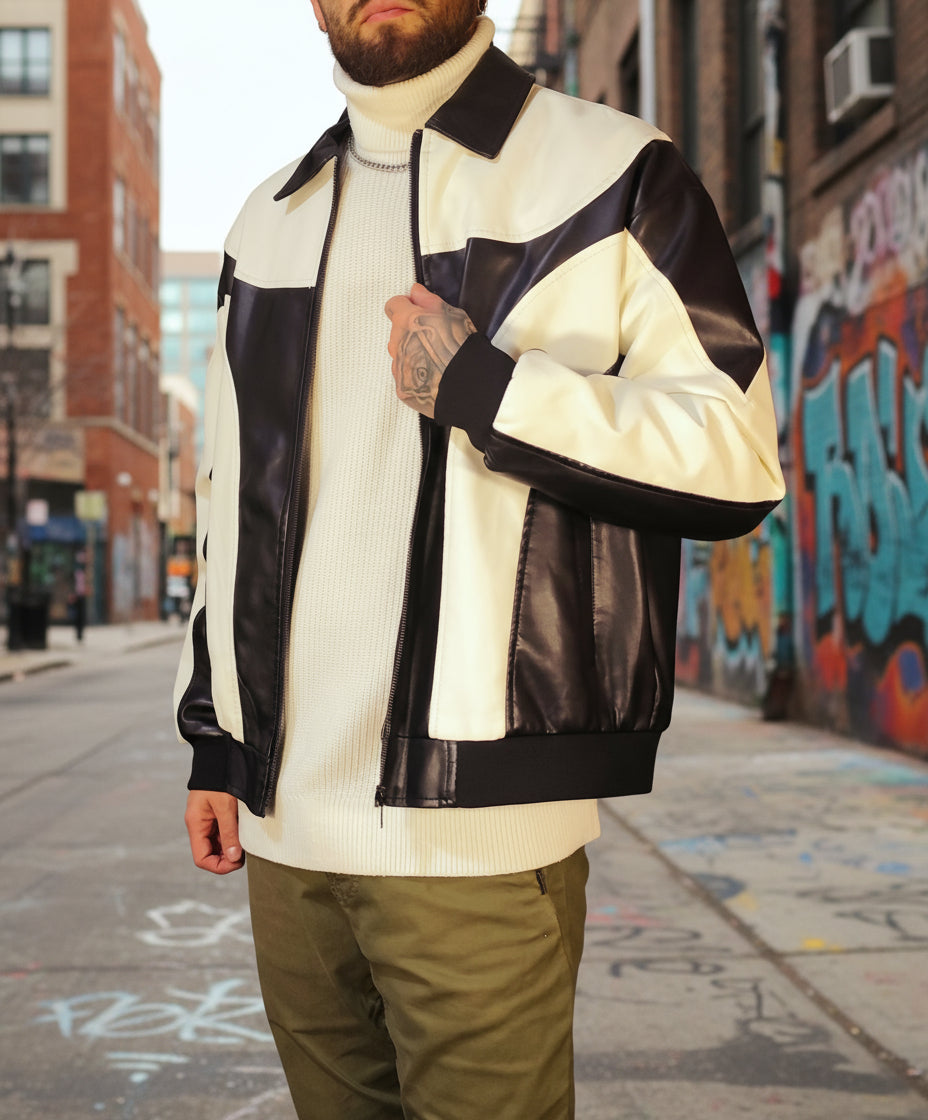 This black and white PU leather jacket features a bold contrast panel design, regular fit, and a clean zip-up front — delivering a striking yet minimalist look.